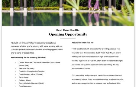 -Hua Hin Hotel Job งานโรงแรมหัวหิน Dusit Thani Hua Hin by admin July 15, 2025 โรงแรมดุสิตธานี หัวหิน มีตำแหน่งงานว่างหลายอัตรา หากท่านใดสนใจสามารถติดต่อสมัครงานได้ที่แผนกทรัพยากรบุคคล จันทร์ถึงศุกร์ 9.00-15.00 น. หรือส่งประวัติมาที่ kamonwan.tn@dusit.com และโทรสอบถามข้อมูลเพิ่มเติมที่เบอร์ 032-520009 ต่อ 2031 ขออนุญาตติดต่อกลับเฉพาะท่านที่ผ่านการคัดเลือกเท่านั้น ... Read More