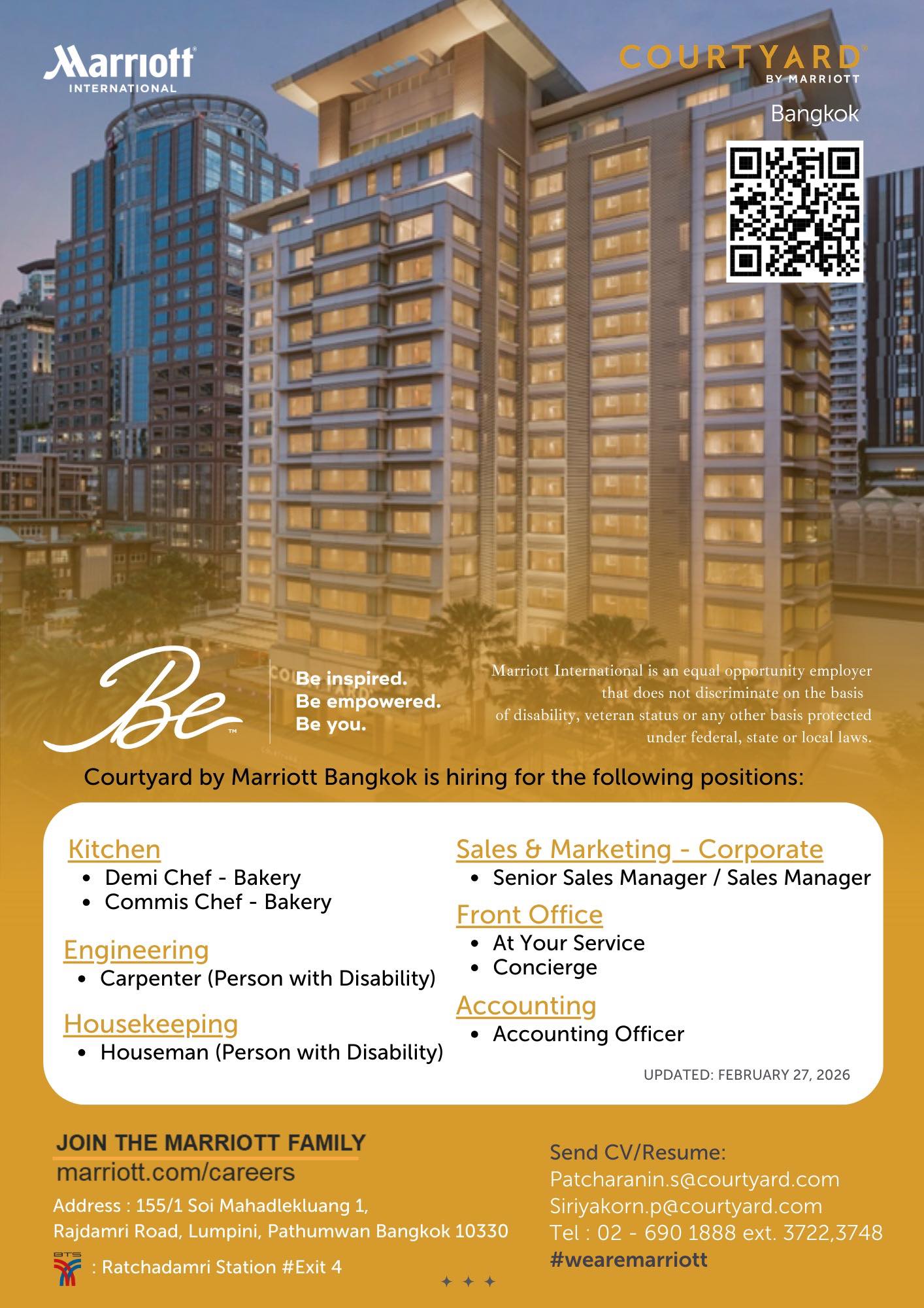 โรงแรมคอร์ทยาร์ด โดย แมริออท กรุงเทพ กำลังเปิดรับสมัครสมาชิกใหม่ เพื่อมาเป็นส่วนหนึ่งของครอบครัวแมริออท ท่านใดสนใจสามารถส่งใบสมัครมาที่