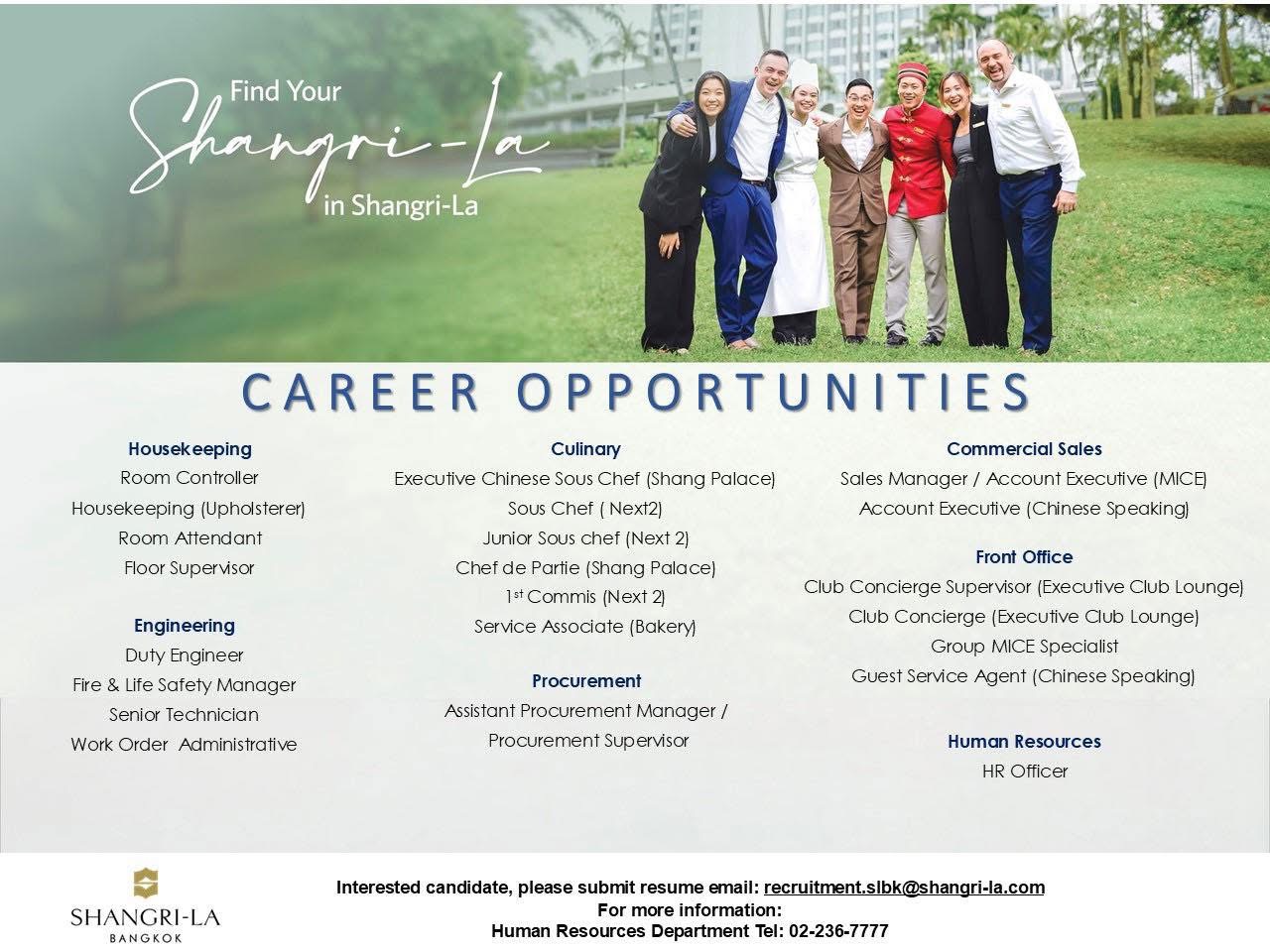 ขออนุญาตประชาสัมพันธ์ตำแหน่งงานว่าง ประจำวันที่ 14 เมษายนค่ะ โรงแรมแชงกรี-ลา กรุงเทพฯ เปิดรับสมัครตำแหน่งงานว่าง สนใจสามารถส่ง CV มาได้ที่ recruitment.slbk@shangri-la.com หรือสอบถามข้อมูลโทร 02-236-7777