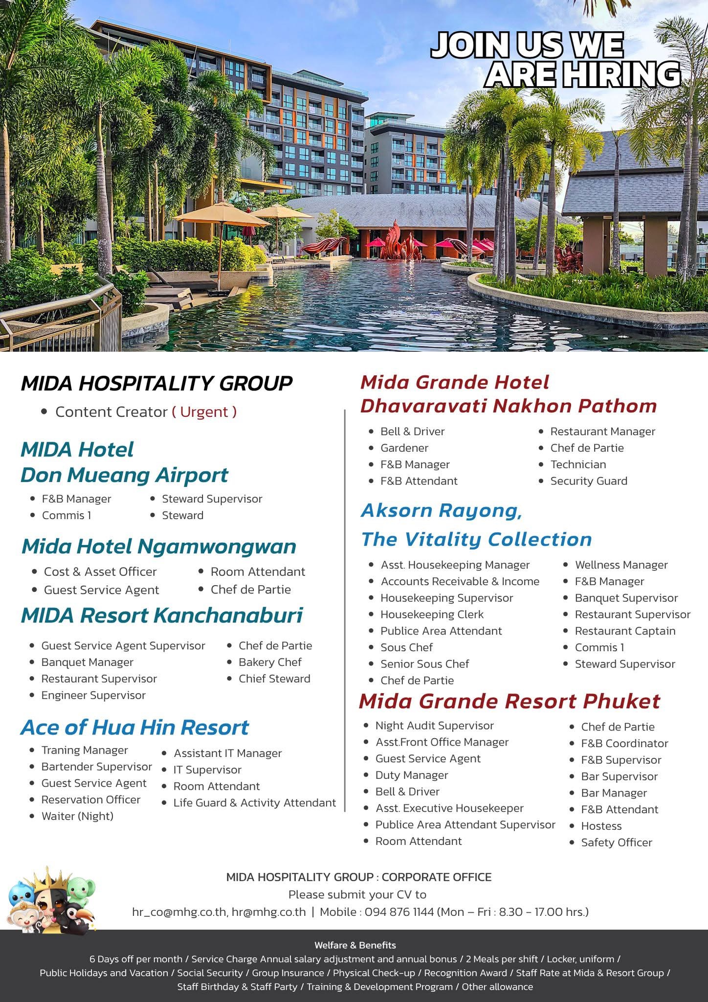 โรงแรมในเครือไมด้า (Mida Hospitality Group) เปิดรับสมัครงาน ท่านใดสนใจส่งประวัติเข้ามาได้ที่ : hr_co@mhg.co.th, hr@mhg.co.th