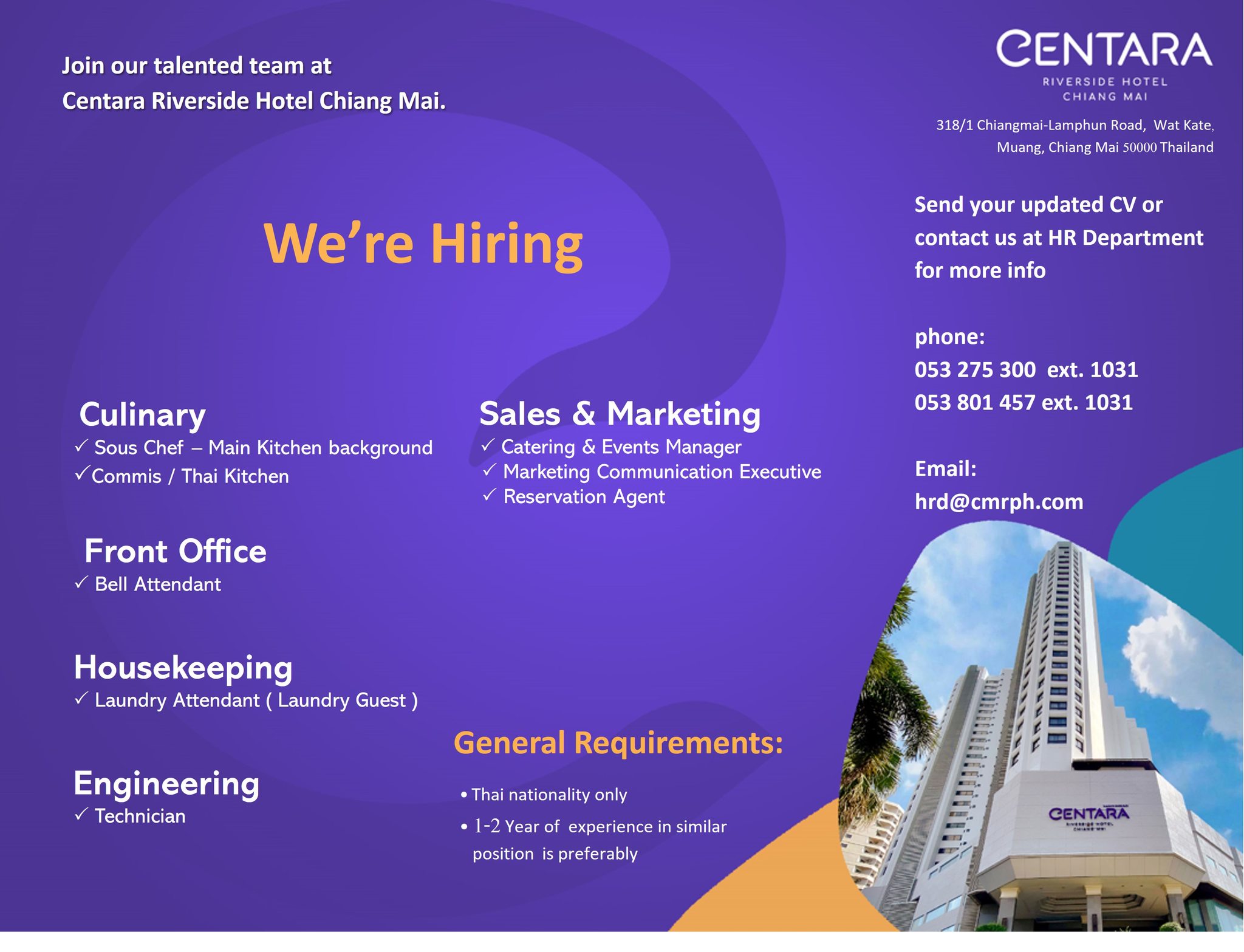Email: hrd@cmrph.com เพื่อพิจารณาคุณสมบัติเบื้องต้น หรือ สอบถามข้อมูลเพิ่มเติม โทร. 053-275300 ติดต่อ ฝ่ายทรัพยากรบุคคล (ในวันและเวลาทำการ)