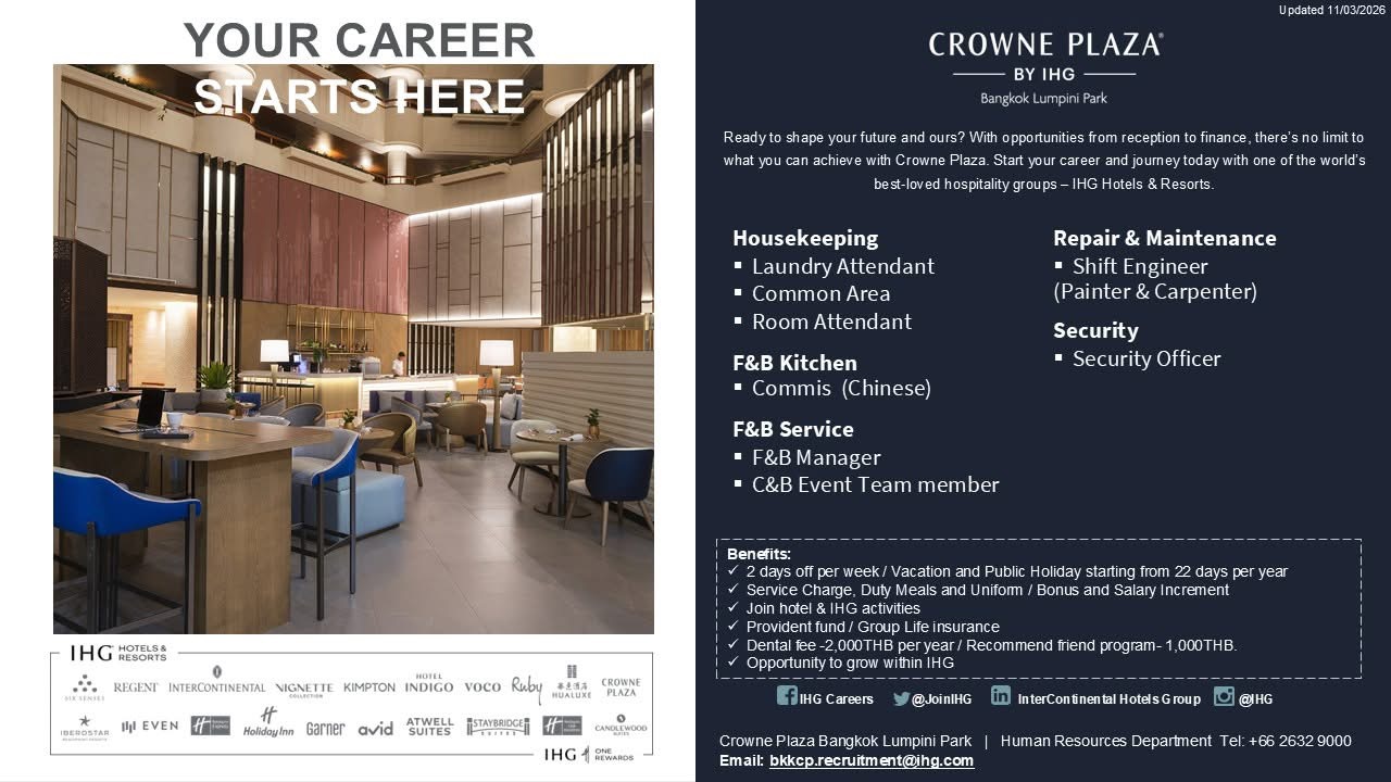 สำหรับผู้ที่สนใจสามารถส่งประวัติ / Resume มาได้ที่ bkkcp.recruitment@ihg.com