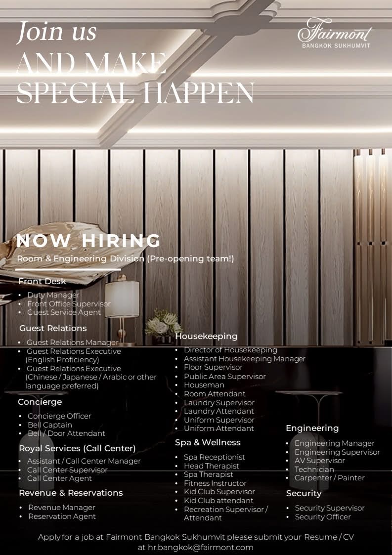📍Update ตำแหน่งงานว่างในแผนก Rooms และ Engineering ทีมเปิดโรงแรม Fairmont Bangkok Sukhumvit