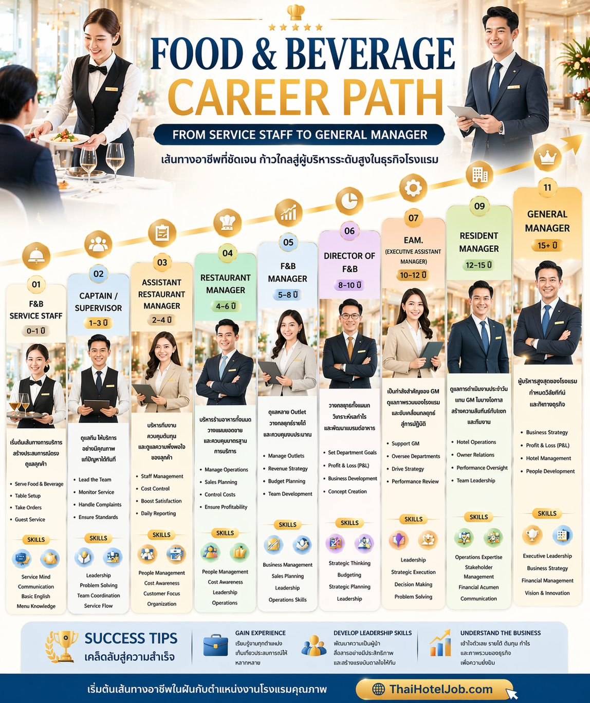 สายงาน Food & Beverage (F&B) เป็นอีกหนึ่งเส้นทางหลักของโรงแรม ที่สามารถเติบโตไปถึงระดับ General Manager ได้ โดยเฉพาะคนที่เริ่มจากหน้างาน (Service) แล้วพัฒนาไปสู่การบริหาร