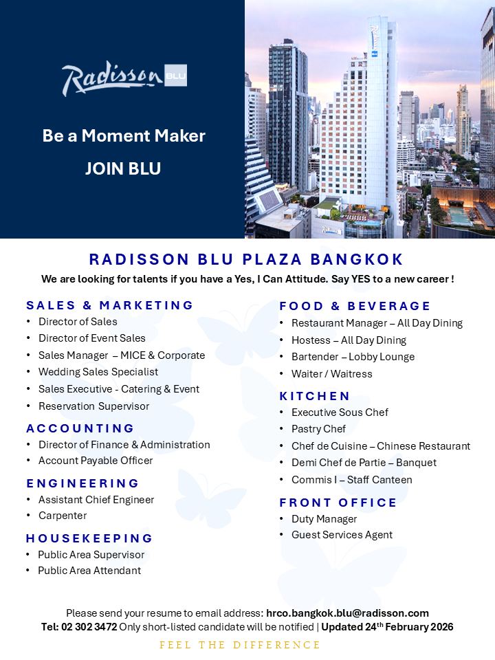 Radisson Blu Plaza Bangkok is looking for experienced candidates.