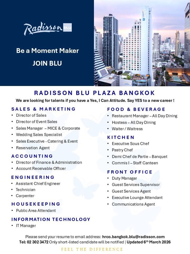 Radisson Blu Plaza Bangkok is looking for experienced candidates.