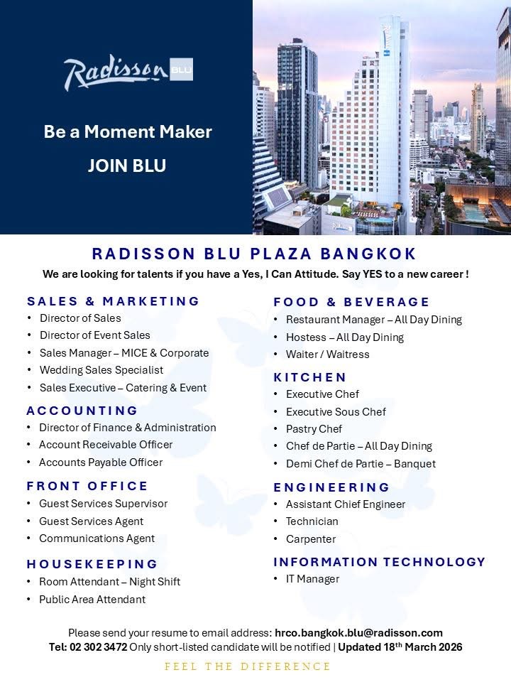 Radisson Blu Plaza Bangkok is looking for experienced candidates.