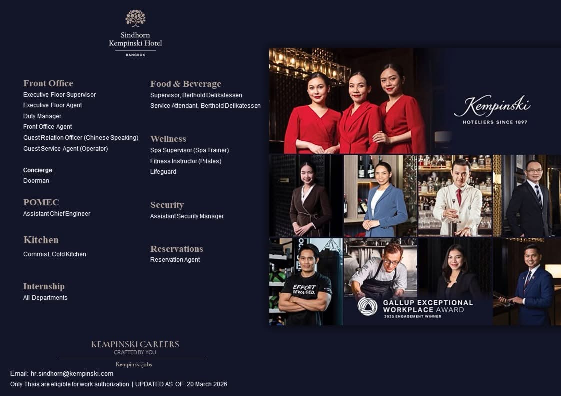 Sindhorn Kempinski Hotel Bangkok และ The Residences at Sindhorn Kempinski เปิดรับสมัครพนักงานหลายอัตรา เพื่อร่วมเป็นส่วนหนึ่งกับเรา สามารถส่งประวัติการทำงานมาได้ที่