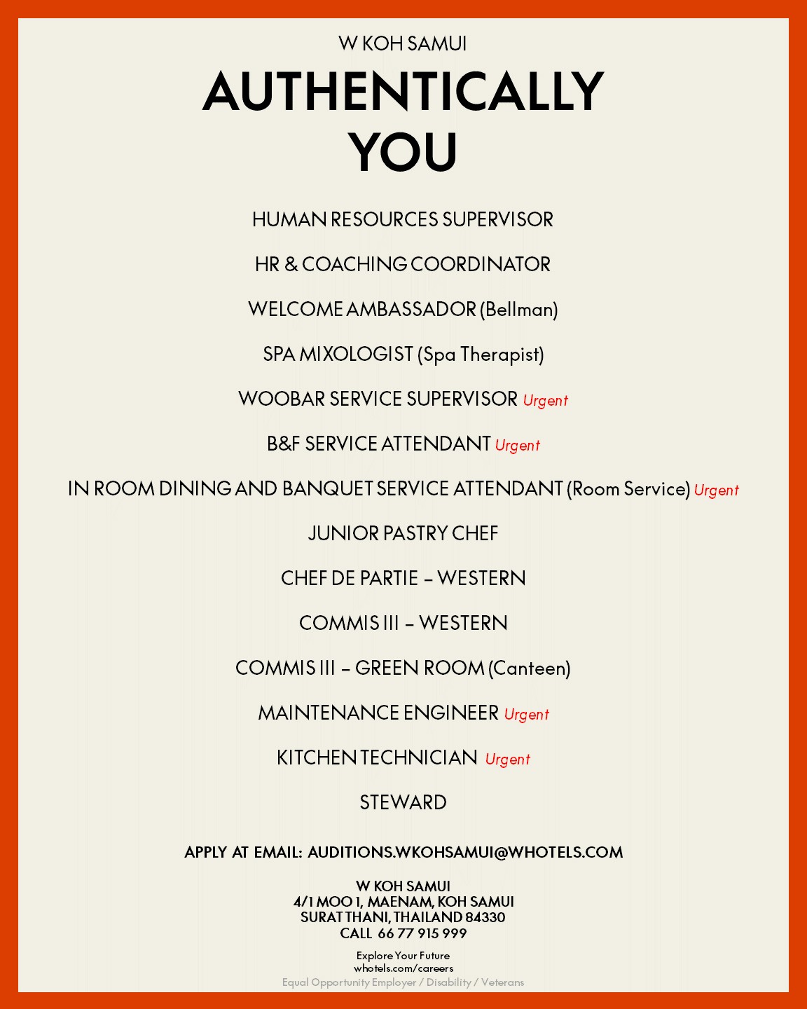 ขออนุญาตประชาสัมพันธ์ตำแหน่งงานว่างของโรงแรมดับเบิ้ลยู เกาะสมุยนะคะ