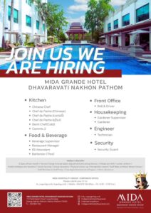 โรงแรมไมด้า แกรนด์ ทวารวดี นครปฐม เปิดรับสมัครพนักงานหลายตำแหน่ง ท่านใดสนใจสามารถส่ง ประวัติโดยย่อมาได้ที่ Email ด้านล่าง ที่ตั้ง : โรงแรมไมด้า แกรนด์ ทวารวดี ...